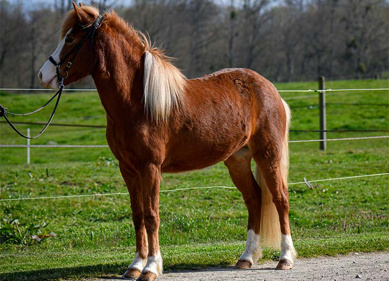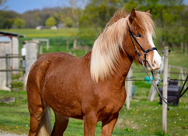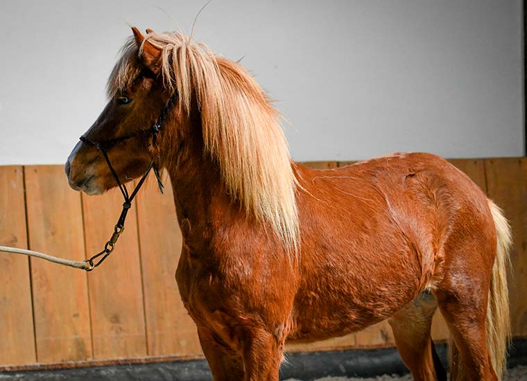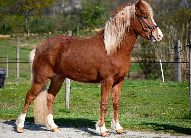 Medalia est une pouliche alezane avec liste, balzanes et œil bleu de Teista frá Lynghóli et Herjólfur frá Ragnheiðarstöðum.